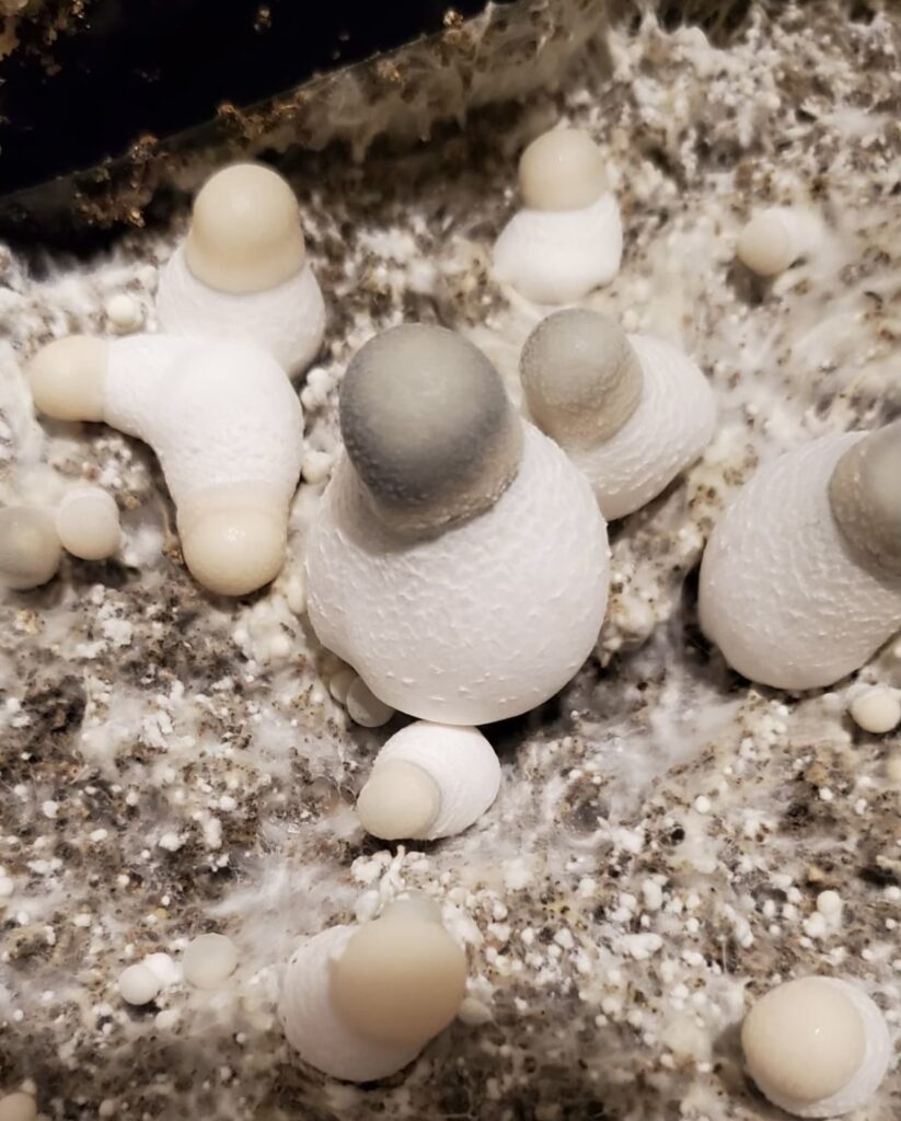Penis Envy Mushrooms: These mushrooms are a little different. In the wild, they have more of a thicker stem and a more bulbous cap, which is nowhere near as wide as a Golden Teacher Mushroom. It also has a higher psilocybin concentration at maturity.